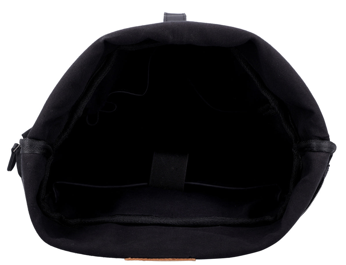 Sin embargo, la mochila no solo destaca por su apariencia, sino también por el espacio que ofrece. En su espacioso compartimento principal con los compartimentos adicionales, caben sin problemas una carpeta DIN A4 o un ordenador portátil de 15". Para ello, cuenta con un compartimento específico para el portátil. También hay espacio para una buena cantidad de libros y una botella de agua grande. El mecanismo de cierre del compartimento principal es tan simple como práctico, y protege tus pertenencias de la humedad y el polvo. El interior de la mochila está forrado con polialgodón resistente al agua, mientras que la parte posterior acolchada y la parte inferior de las correas de hombro ajustables están cubiertas con lona a juego – para una comodidad adicional de transporte.