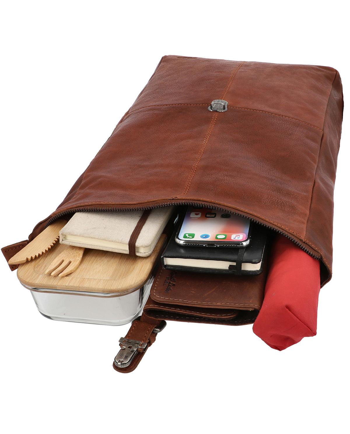 Aunque "Valja" tiene una capacidad de solo unos 9 litros, ofrece suficiente espacio gracias al cuero de cabra de alta calidad para varios cuadernos, billetera, estuche de lápices y provisiones. Un pequeño bolsillo secreto en la parte trasera, que se puede cerrar con cremallera, proporciona seguridad adicional. El cierre de metal completa el diseño y protege tus pertenencias de manera confiable contra el viento, el clima y el polvo. Un compañero fiel para tu perfecta apariencia vintage.
