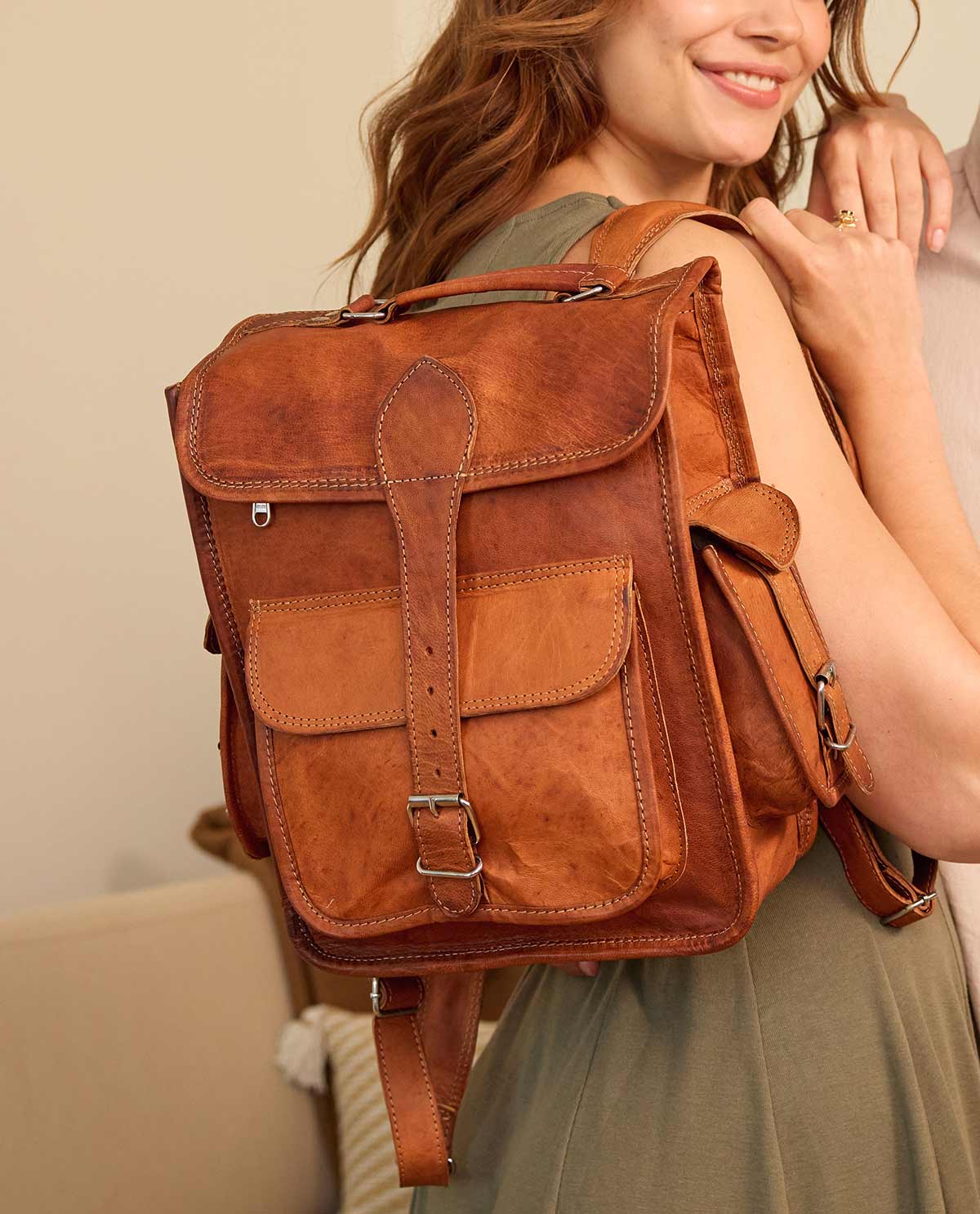 "Eleanor" no es una mochila de piel común y corriente - todo el mundo lo nota a primera vista. Esta preciosa mochila urbana de estilo boho vintage de moda es tan cautivadora por su aspecto como por su diseño compacto pero funcional. Porque esta bonita mochila de cuero ofrece espacio para guardar todo lo que necesitas para un largo paseo, una tarde en el parque infantil o para la próxima salida de compras con tus amigas: ya sea un calendario de bolsillo en formato DIN A6, el smartphone, la cartera y las gafas de sol, la botella de agua y una lata para un tentempié entre horas, en "Eleanor" hay espacio para todo.