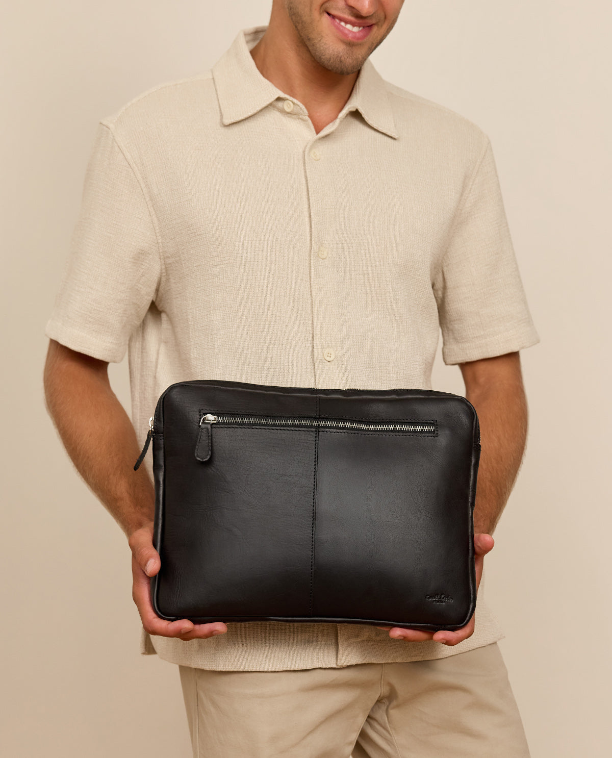 Descubre nuestra exclusiva funda para ordenador portátil, que no sólo cautiva por su diseño actual, sino también por su extraordinaria funcionalidad. Este bolso de piel en elegante color negro es el compañero ideal para tus citas de negocios, tus documentos universitarios o necesidades personales.