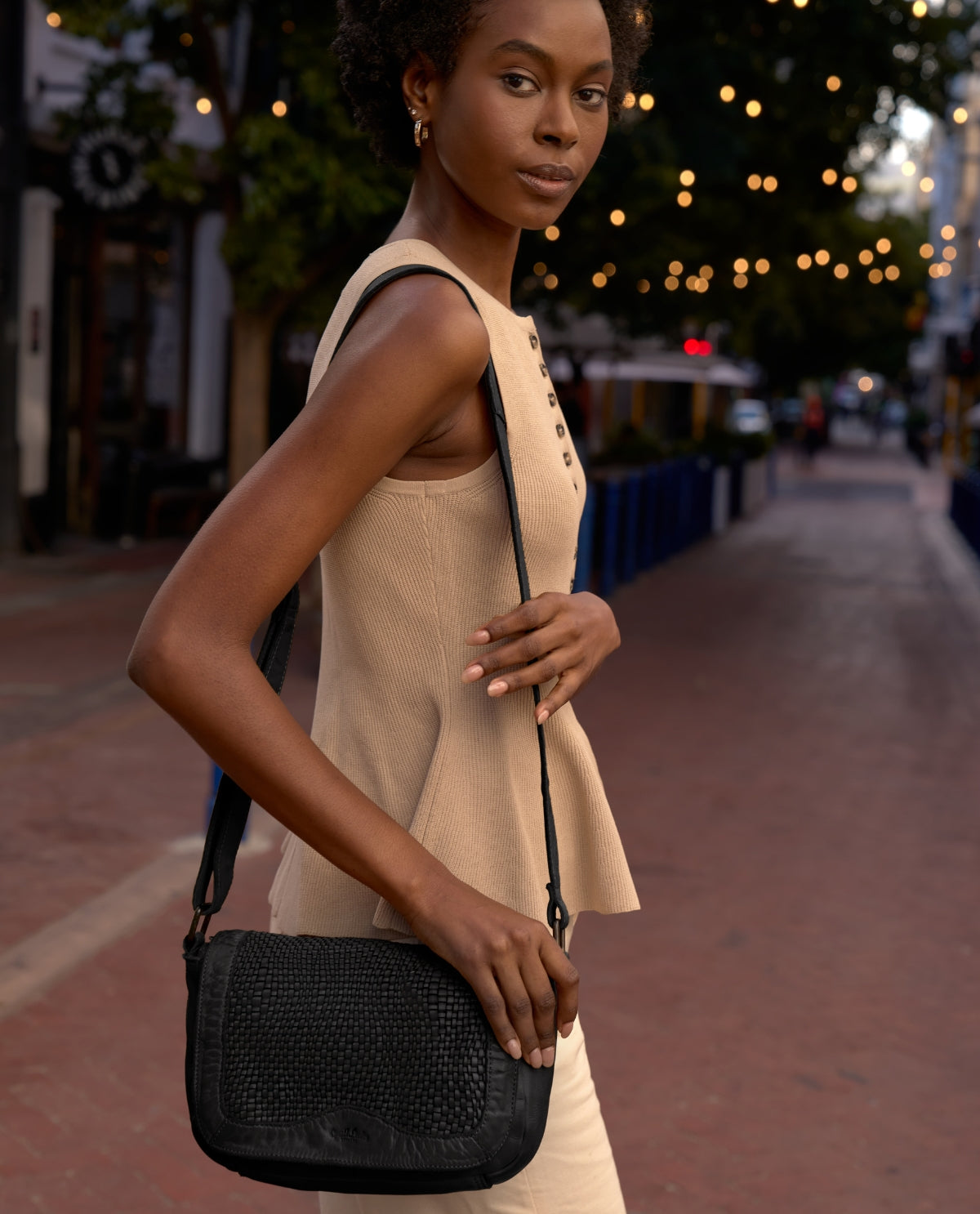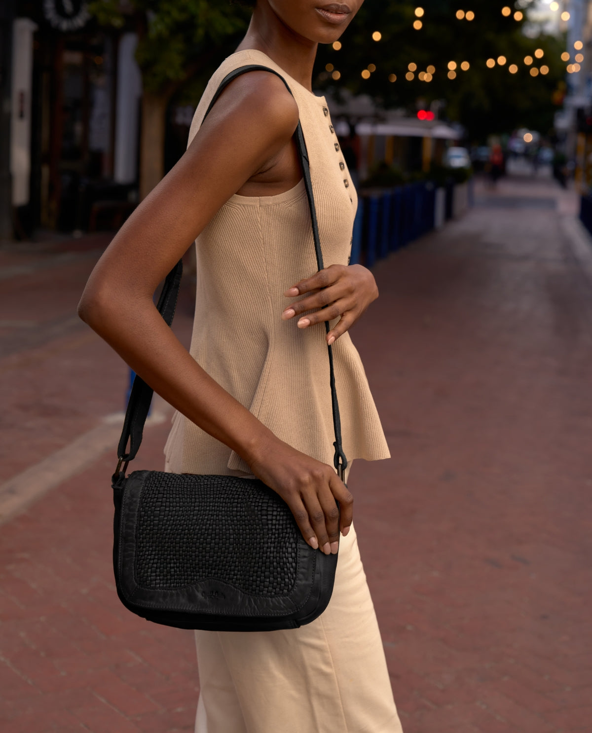 Die kleine Handtasche „Aliya“ ist eine schwarze Lederhandtasche für Damen, die durch ihre geflochtene Oberfläche sofort ins Auge fällt. Das gewaschene Rindsleder wirkt angenehm weich und verleiht der Tasche eine entspannte, hochwertige Ausstrahlung. Bereits im Alltag zeigt sich „Aliya“ funktional: Ein verstecktes AirTag-Fach sorgt für zusätzliche Sicherheit, während der verstellbare Schulterriemen flexible Tragemöglichkeiten bietet. Die Kombination aus Magnetverschluss an der Front und Reißverschluss im Hauptfach verbindet Komfort mit einem sicheren Gefühl unterwegs.