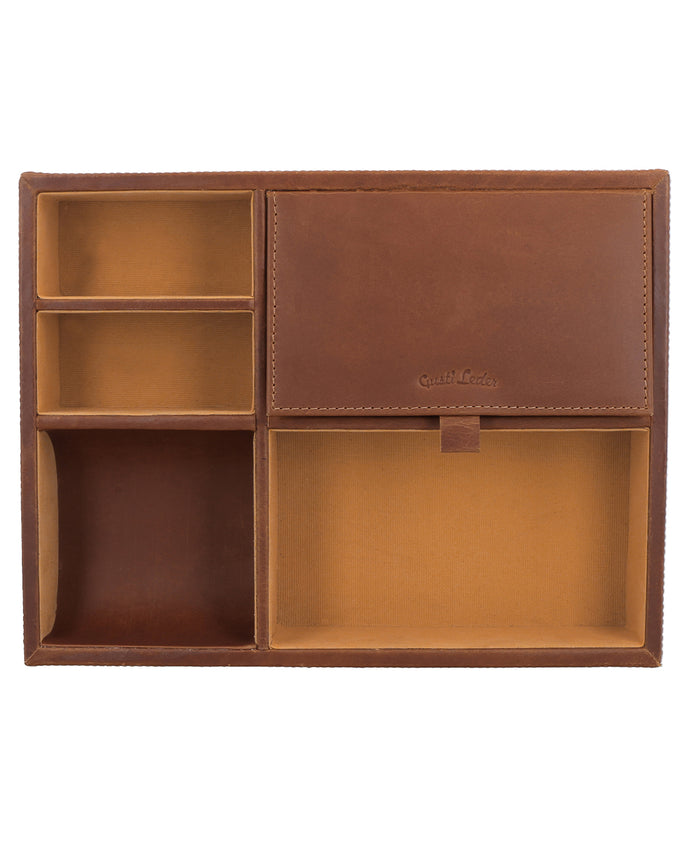 A special highlight of "Bianka" is the compartment with a foldable lid, which is ideal for discreetly storing small items. The interior is lined with a soft, light fabric that not only provides a harmonious contrast but also gently protects your accessories. Whether in the home office, at work, or on the desk at home – "Bianka" is more than just an organizer. It is a stylish statement for order, quality, and attention to detail.