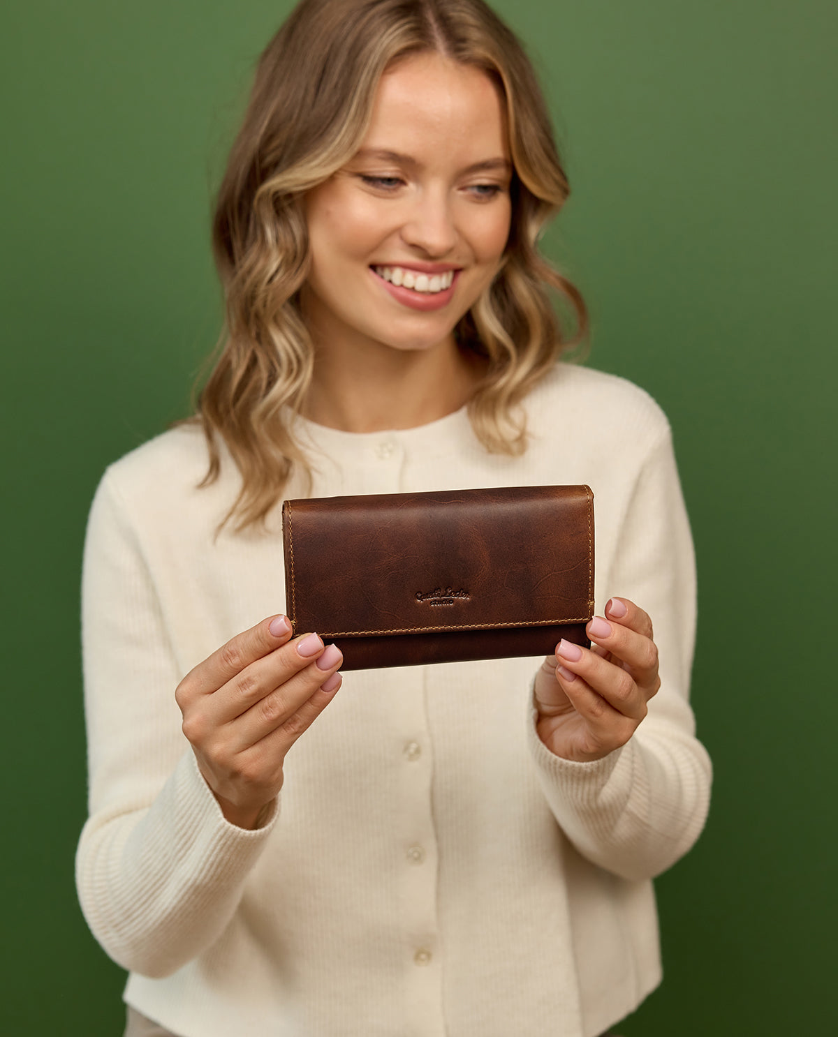 Discover our high-quality women's wallet "Angelique" made of brown leather – an elegant companion that perfectly combines design and functionality. Inspired by the urban Berlin flair, it is ideal for your everyday life, whether shopping in the city, at the café, or traveling. The genuine, durable leather ensures a noble look and a pleasant feel that becomes even more beautiful over time. "Angelique" stands for style, quality, and organization – everything you expect from a modern wallet.