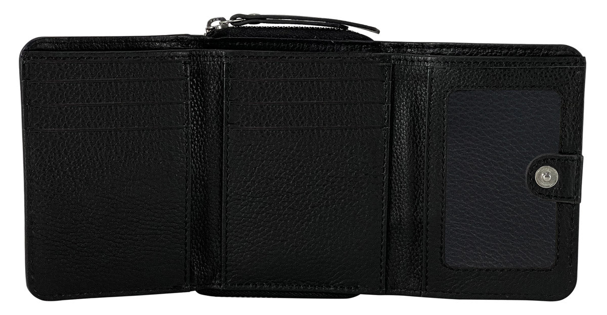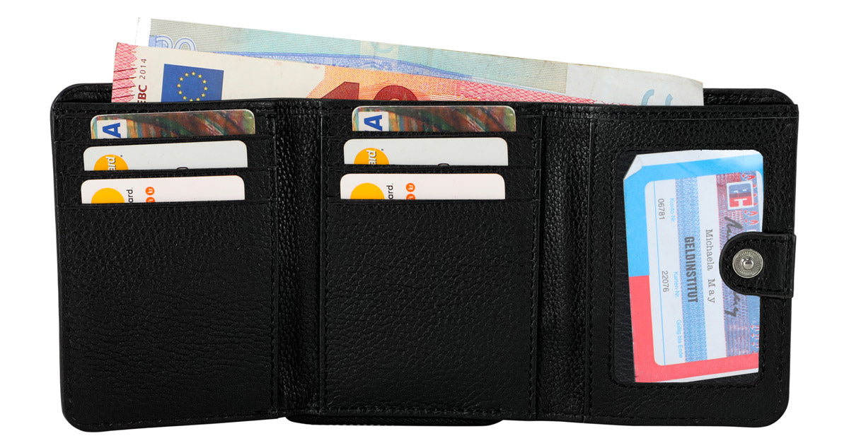 Inside, "Larissa" features a bill compartment, space for up to six cards, and a separate coin compartment with a zipper closure. This prevents your money from falling into the bag. "Larissa" also features a window when opened. Made of high-quality cowhide, the wallet closes with a snap fastener. Throw it in your bag – with "Larissa"!
