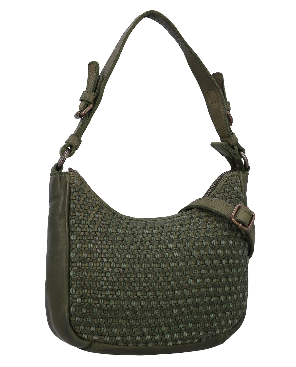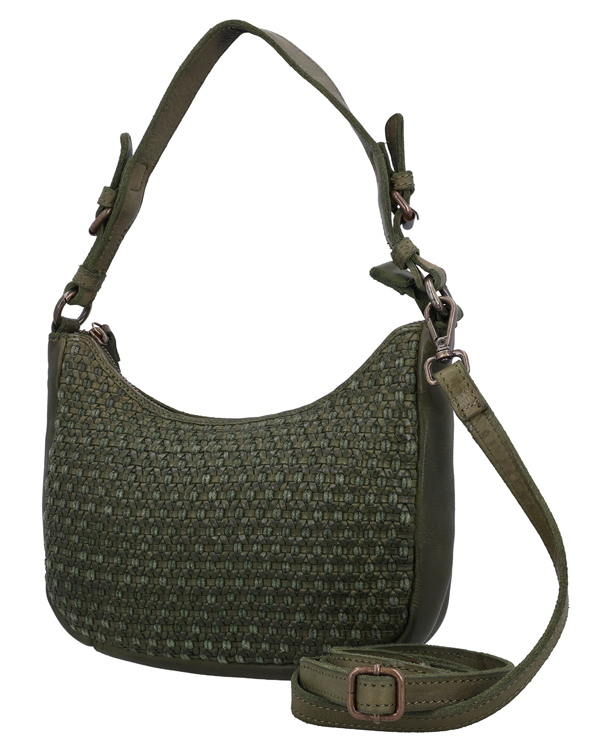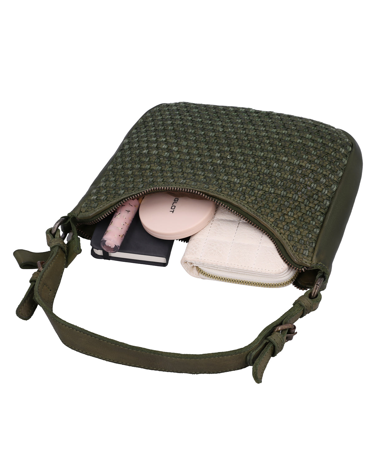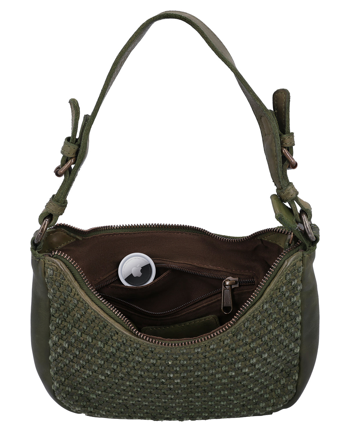 The small "Darina" handbag is a green leather handbag for women that immediately catches the eye with its braided pattern. The structured design gives the bag a special depth and makes it a stylish companion for everyday use and leisure. A hidden AirTag compartment provides additional security, while a removable key ring keeps your essentials close at hand. One main compartment with zipper reliably protects your contents, and thanks to two adjustable and removable straps, you can flexibly adapt "Darina" to your style.