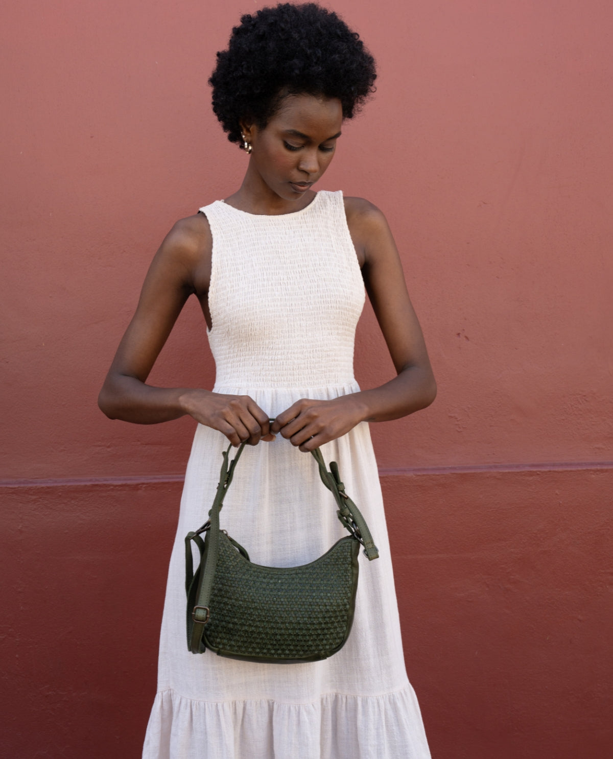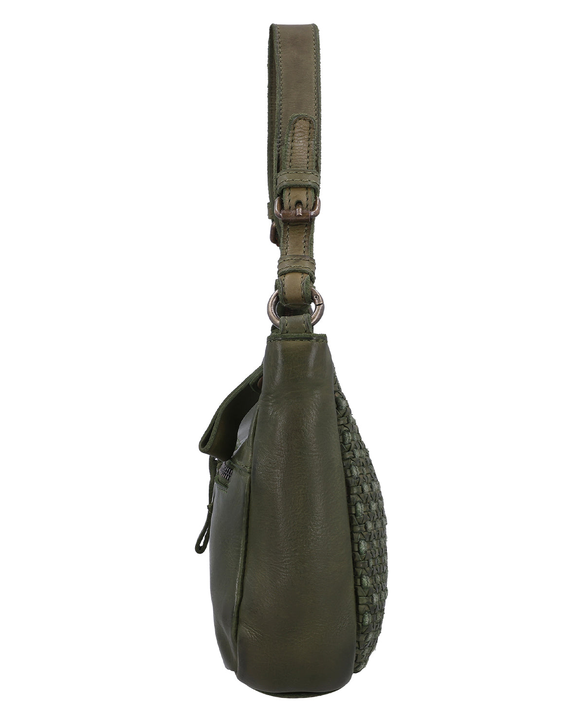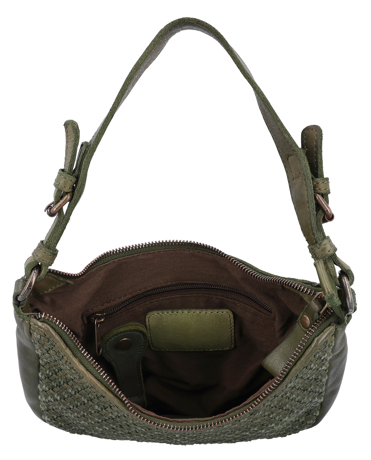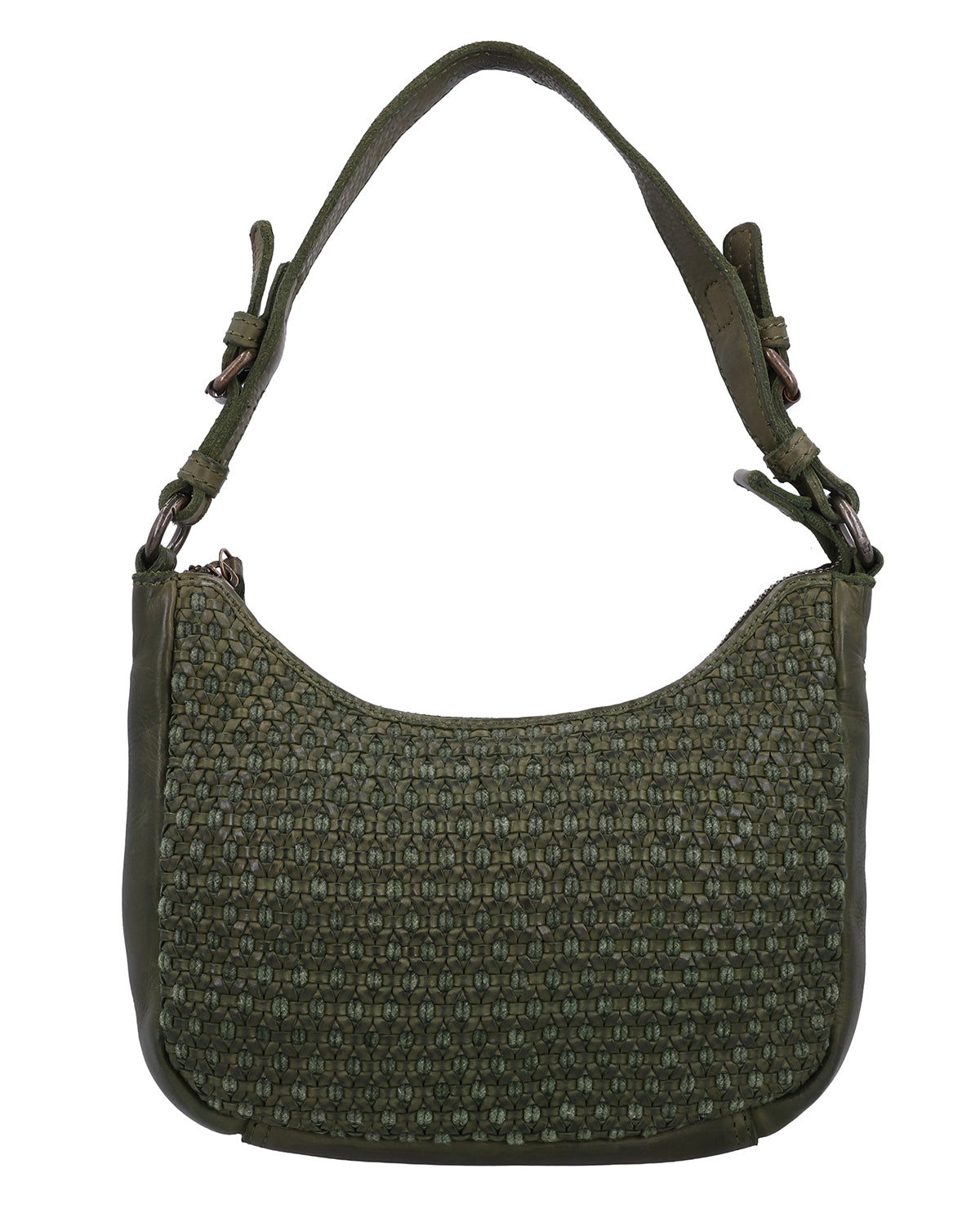 The small "Darina" handbag is a green leather handbag for women that immediately catches the eye with its braided pattern. The structured design gives the bag a special depth and makes it a stylish companion for everyday use and leisure. A hidden AirTag compartment provides additional security, while a removable key ring keeps your essentials close at hand. One main compartment with zipper reliably protects your contents, and thanks to two adjustable and removable straps, you can flexibly adapt "Darina" to your style.