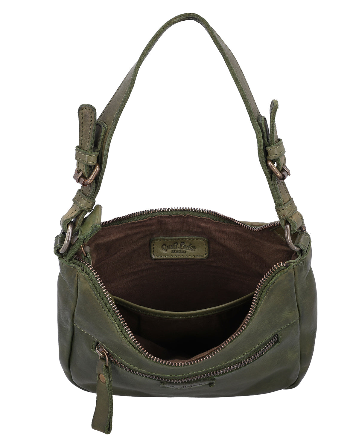 Inside, slip pockets and a zippered compartment keep everything tidy. An additional zippered exterior pocket provides quick access to items you need frequently when on the go. An engraving patch allows you to personalize your bag, making "Darina" a truly unique leather handbag. This small shoulder bag combines a distinctive look with a functional structure, while remaining pleasantly light and versatile.