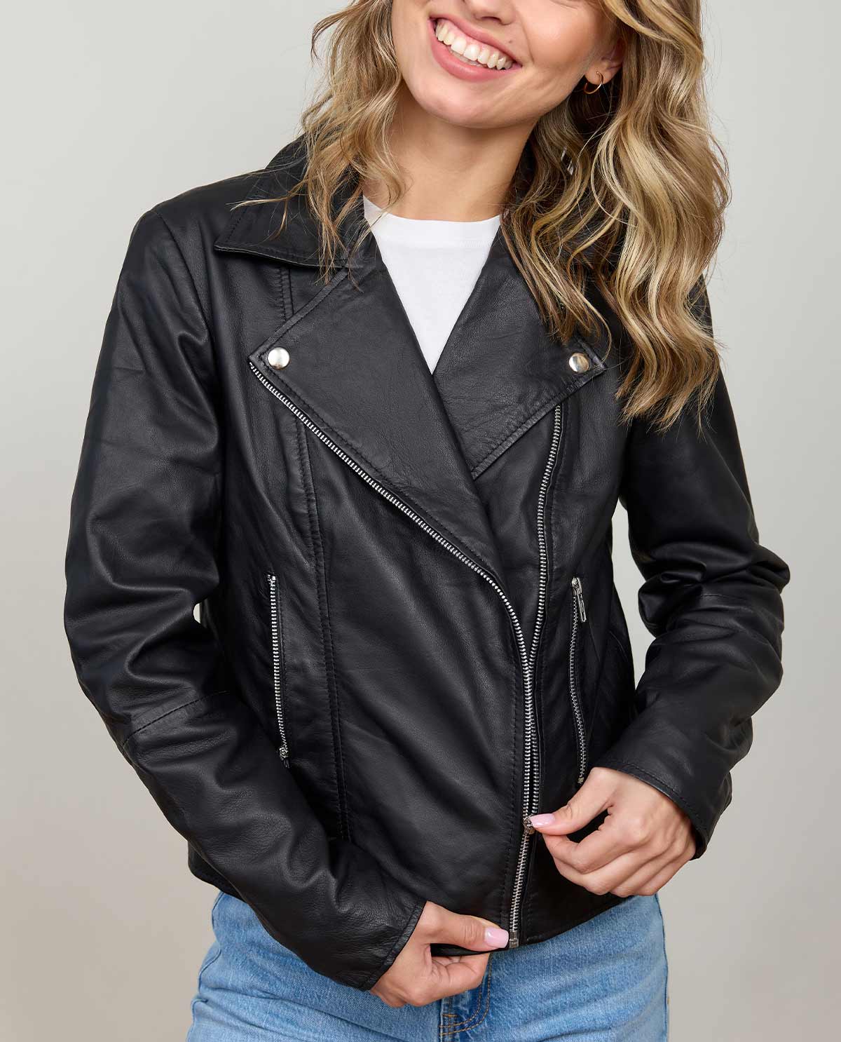 A classic with a modern twist – the "Ova" biker jacket made of black genuine leather adds a striking, stylish touch to your outfit. Whether you pair it with jeans and boots or layer it over a dress, this leather jacket makes a fashion statement. The high-quality leather feels pleasantly soft and develops a unique patina over time – just as unique as you are.
