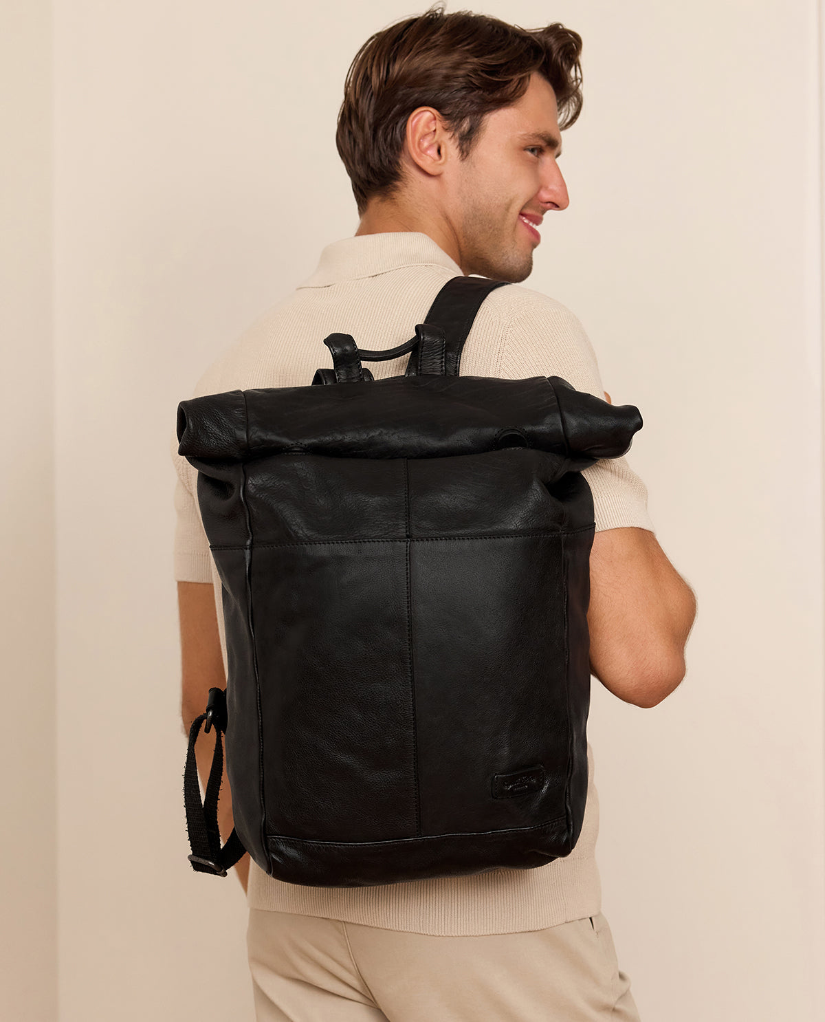 No matter if you take her to the office, college, or use her in your free time, our beautiful messenger bag “Joy” will win you over in no time at all. This backpack will charm you with its versatility, comfort, and spaciousness as well as its discreet and elegant design. In addition to this, the slim-cut day pack made of black cowhide leather stands out from the crowd with its trendy roll top—a look that you just can't get away from at the moment.
