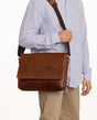 You'll turn heads at the office with this high-quality brown leather satchel on your shoulder. It's made of sturdy cowhide leather that gives the bag an elegant yet rustic look. There's plenty of space for your important documents, laptop, tablet, folders, and more in this satchel.