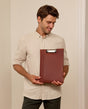 "Asher" destaca por su distribución interior inteligente: un amplio compartimento permite guardar notas o documentos, mientras que dos compartimentos más pequeños son ideales para tarjetas de visita u otros elementos esenciales. Así tendrás todo a la mano y perfectamente organizado. Ya sea en la oficina, en viajes de negocios o en la universidad, esta carpeta de conferencia es la combinación perfecta de funcionalidad y diseño atemporal en cuero.