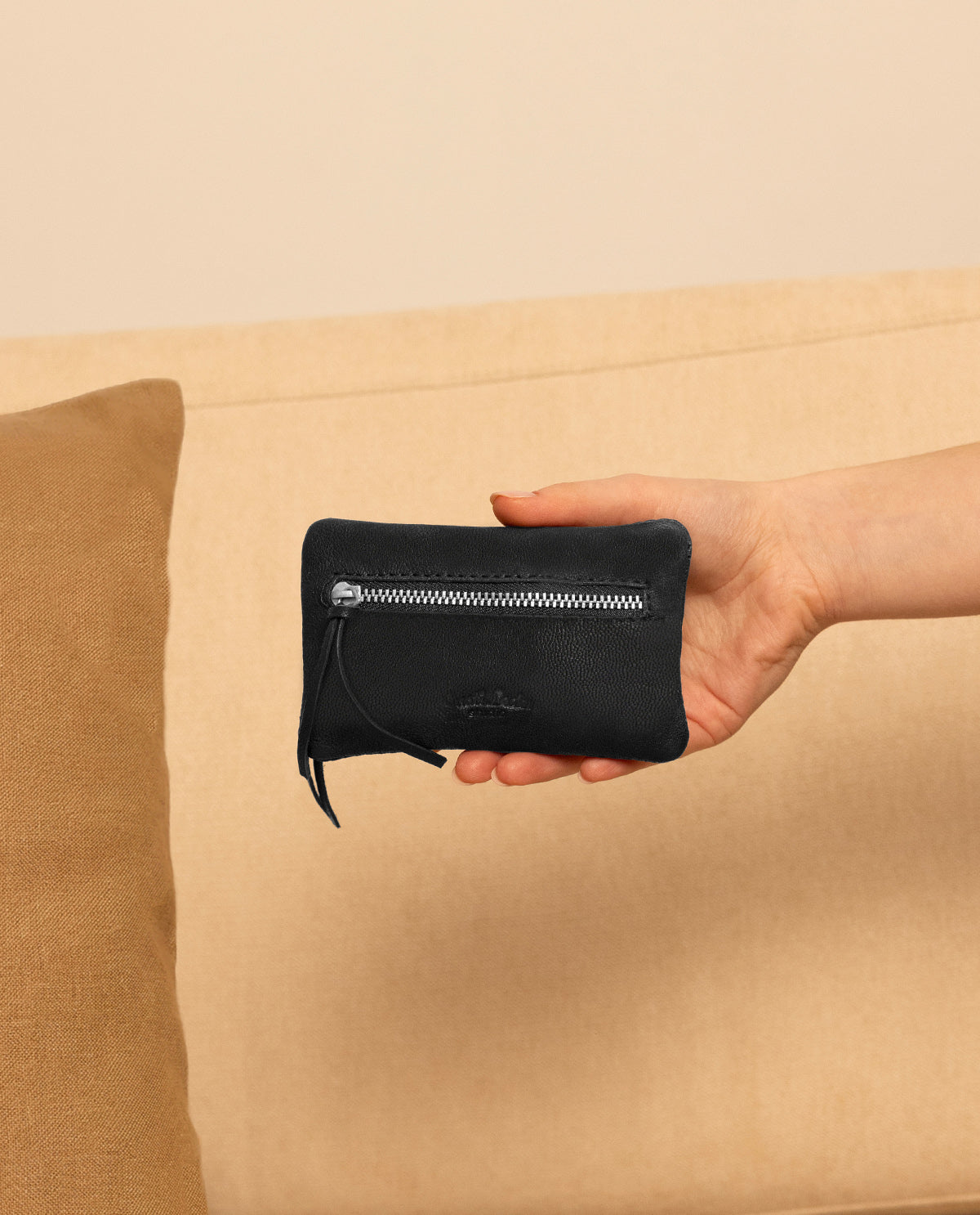 La cartera de cuero negro destaca por su diseño elegante y compacto. El cierre principal está en el centro, lo que permite un acceso rápido a tus tarjetas y efectivo. En la parte posterior, un cierre adicional proporciona mayor seguridad. Esta cartera es perfecta para el uso diario, ya que es práctica y tiene mucho estilo.