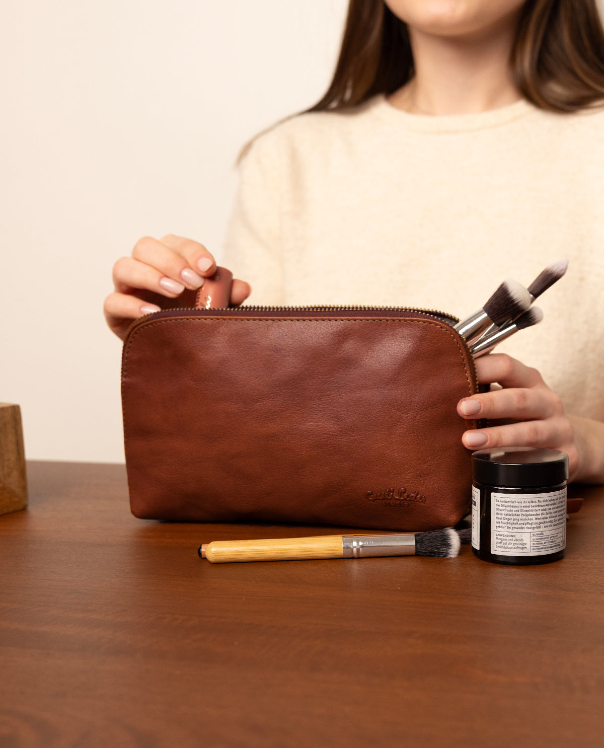 Ya sea para viajeros de negocios o turistas, para un viaje improvisado o como lugar donde guardar tu maquillaje, «Eli» combina funcionalidad con un estilo vintage desenfadado. La piel de búfalo de alta calidad y su práctico tamaño no solo garantizan una organización perfecta, sino que también convierten a este neceser en un complemento elegante. La práctica cremallera y el diseño bien pensado ofrecen espacio suficiente para todos los artículos de higiene importantes, como desodorante, champú, acondicionador, pasta de dientes y mucho más. Para una mayor practicidad en el día a día, «Eli» cuenta con un forro repelente al agua en el interior, lo que facilita mantenerlo todo limpio. Inspirado en Berlín, «Eli» es el compañero perfecto para todos aquellos que valoran la funcionalidad y el estilo.