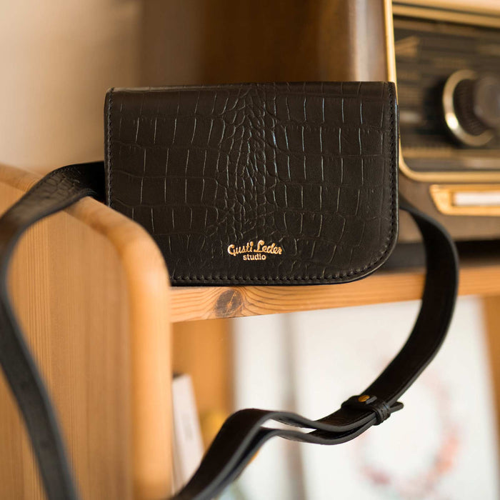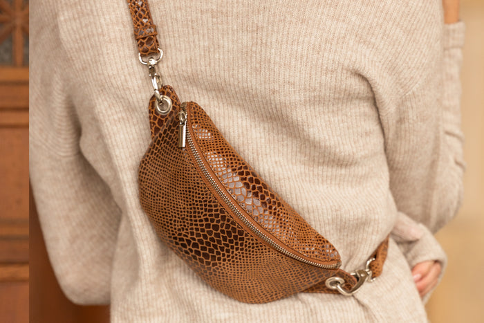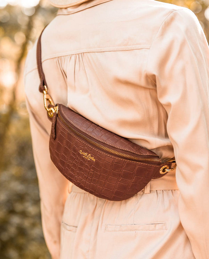 Prepárate para tu próxima salida nocturna con nuestra "Annabelle". Muy práctica, esta riñonera es la mejor compañera para tu día a día, para las noches o en festivales. El aspecto de cocodrilo en el bolso le da un look elegante y a la moda y complementa cualquier atuendo que uses. También puedes regalar este hermoso artículo de cuero a tus seres queridos en ocasiones especiales.